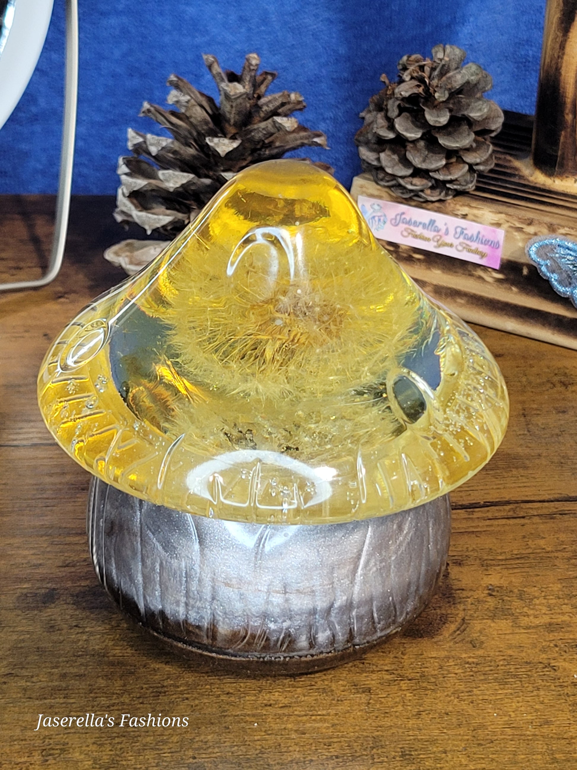 The dimensions of this box measure 3.35" x 3.70". Its top is transparent and tinted yellow, allowing you to see a fully seeded and dried dandelion inside.